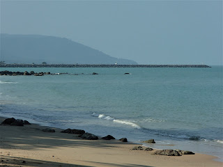 HIN NGAM BEACH is to the south - it's a stone beach backed by a few inexpensive restaurants and some holiday villas. Headland in distance (may be clearer if you click-expand image) separates this bay from SICHON BEACH. White building is part of a fisheries research center - has a significant pier.